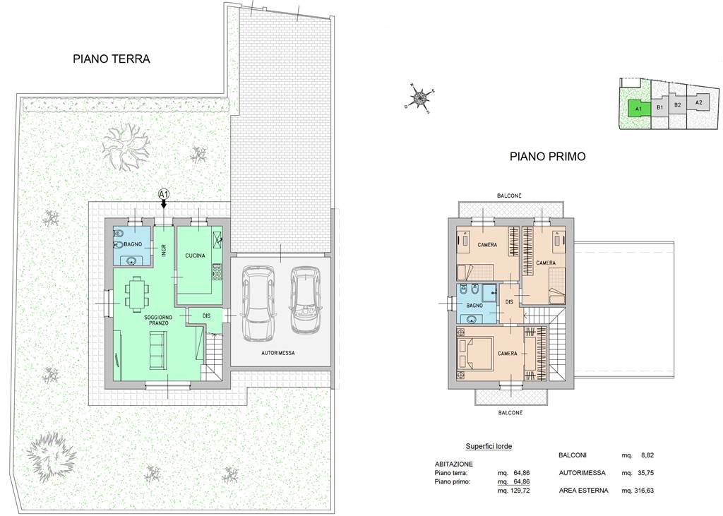 La Villetta A1 rappresenta l’equilibrio perfetto tra indipendenza, comfort e qualità costruttiva. Situata in posizione angolare all’interno del complesso di quattro ville, gode di un’ampia area esterna su tre lati, con giardino privato e doppio balcone al piano superiore. L’ingresso è completamente indipendente, così come l’autorimessa doppia in larghezza, direttamente collegata all’abitazione.